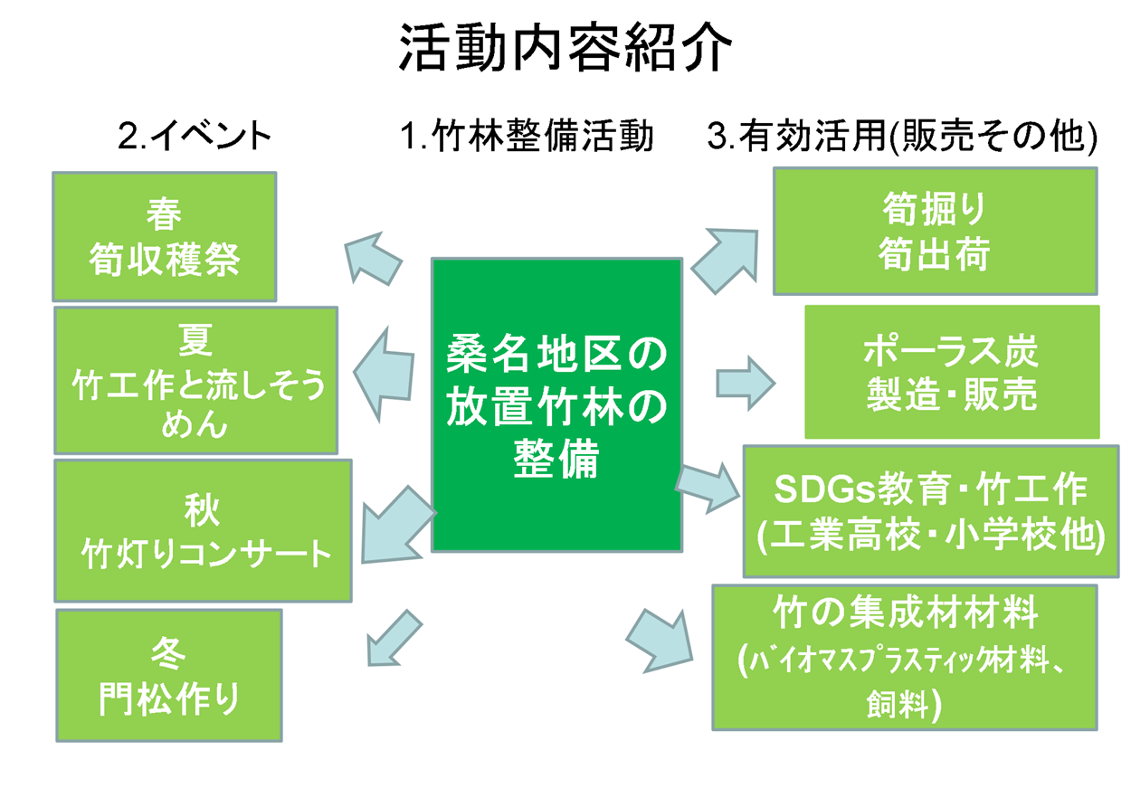 一年を通じ、春は筍堀りとバーベキューを収穫祭として、夏は桑名運動公園で親子向けの竹工作と流しそうめん、秋は「竹の十三夜」2000個の竹灯籠の灯りの中で地元演奏家によるコンサートを冬は門松つくりを「竹を愛する」イベントとして開催しています。
