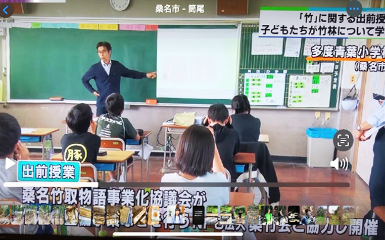 授業では、竹林の写真を見たり、実際に竹をさわったりして、自然とのかかわりを学びます。。みんなで竹林を守り、未来の地球を大切にしていく気もちを育てるお手伝いをしています。