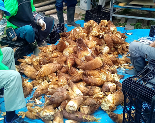 整備した竹林の維持・メンテを兼ねて毎年3~4月に筍掘りを行っています。掘った筍は筍収穫祭等で筍料理として振舞っています。